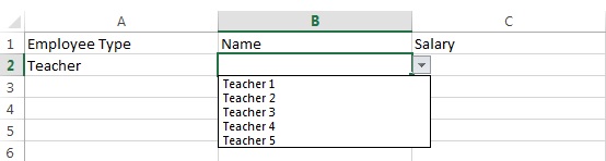 • In Sheet1, select Teacher in Employee Type. Now click the dropdown of Column B. You will see that Teacher 6 is automatically added to the dropdown list because the Teacher range is now also dynamic.