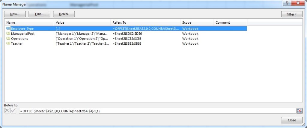 • but it would not have created a dynamic range. The use of the OFFSET formula has made the range dynamic. So, for example, if you enter another category in A5, it will automatically be included in the range Employee_Type.